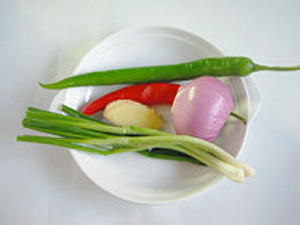 2、準(zhǔn)備好配菜:青紅椒、洋蔥、生姜、香蔥