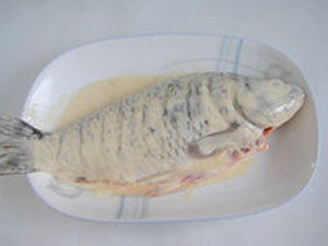 6、腌制好的鯉魚,去掉蔥、姜,兩面均勻的掛上一層面糊。