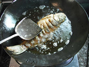 7、鍋中燒熱適量油,7成熱時(shí)下入鯉魚,炸至外皮定型,轉(zhuǎn)中火炸約3分鐘至熟,撈出,再次把油加熱,然后下入鯉魚復(fù)炸約30秒,至表面金黃而酥脆,撈出瀝油后裝入盤中。(開始熱油下鍋,是要讓魚身外面的面糊快速定型,封鎖住魚肉里的水份,定型后轉(zhuǎn)中火炸熟,也是同樣的道理。而最后復(fù)炸一下,是為了讓魚的表面金黃而且特別酥脆)