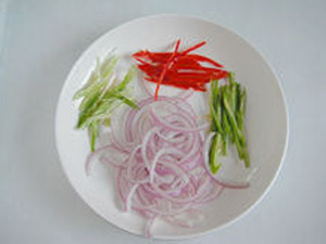 8、在炸魚前,腌制魚的那個(gè)時(shí)間里,來準(zhǔn)備配料:把半個(gè)青椒和半個(gè)紅椒切成絲、一小塊洋蔥切成絲,蔥也切成絲。(這些的量都不用多)