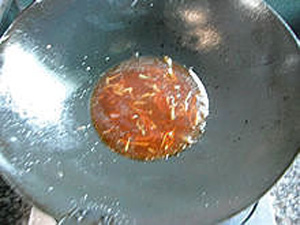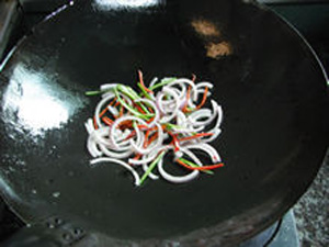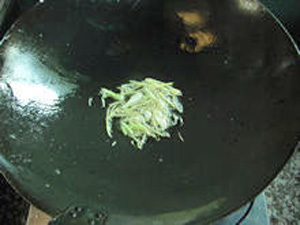 12、鍋中燒熱少許油,下入蔥、姜絲煸香。