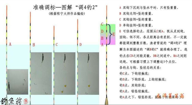 何謂“調(diào)四釣二”?顧名思義,調(diào)四釣二就是指調(diào)標(biāo)的時(shí)候空鉤半水調(diào)四目,即示標(biāo)露出水面四目;釣的時(shí)候掛上雙餌,調(diào)整浮漂位置,使示標(biāo)露出二目。調(diào)四釣二是臺(tái)釣的基本調(diào)標(biāo)方法。 調(diào)四釣二圖解 詳細(xì)介紹 如何實(shí)現(xiàn)調(diào)四:...